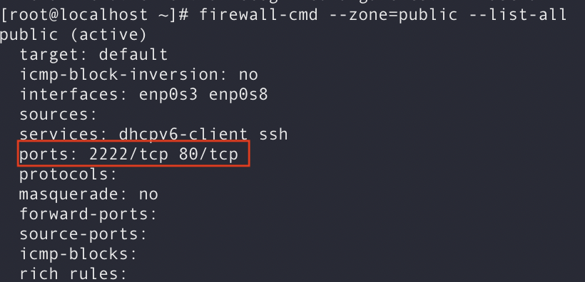 - 80포트 설정 후 다시 조회 했을 때 ports에 80포트가 정책으로 허용이 되어 있는 상태
