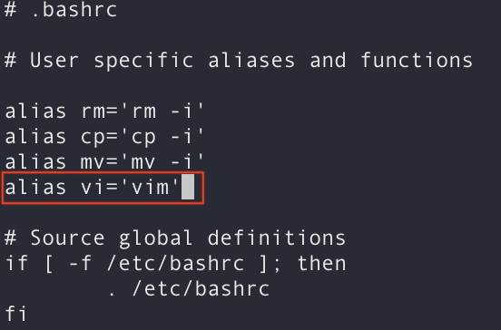 - alias vi='vim' 내용을 추가 후 저장