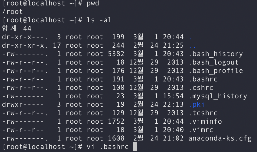 - 현재 ls -al을 입력을 했을 때 .viminfo와 .vimrc 파일이 생성이 되어 있음