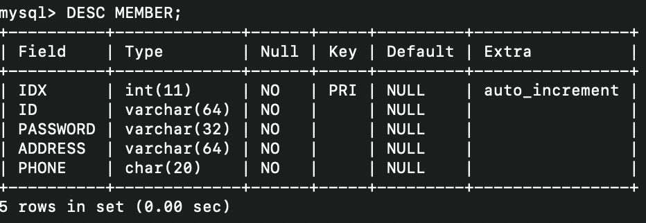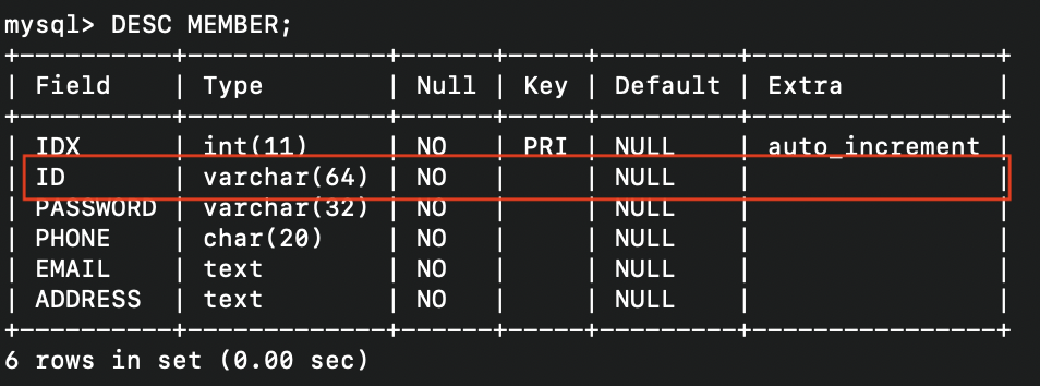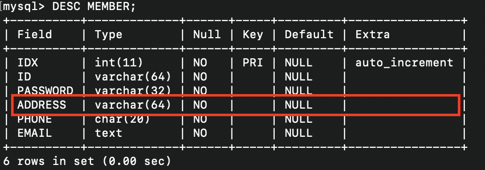 - 실제로 테이블에 ADDRESS가 PASSWORD 필드 뒤로 수정이 되었는지 조회한 상태