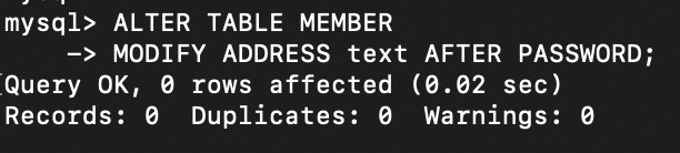 - 테이블에 ADDRESS 컬럼의 위치를 PASSWORD 필드 뒤로 이동한 상태