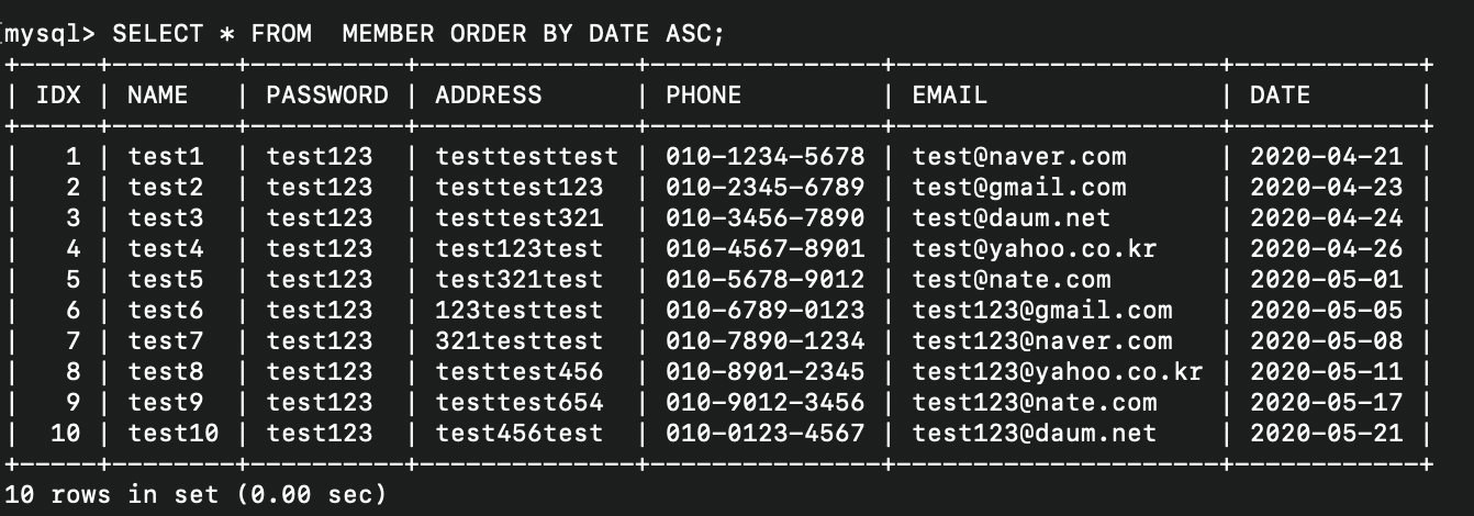 * 사용한 명령어 : SELECT * FROM MEMBER ORDER BY DATE ASC;