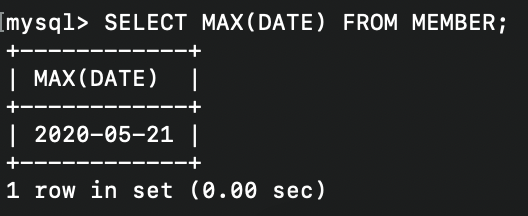 - 사용한 명령어 : SELECT MAX(DATE) FROM MEMBER;