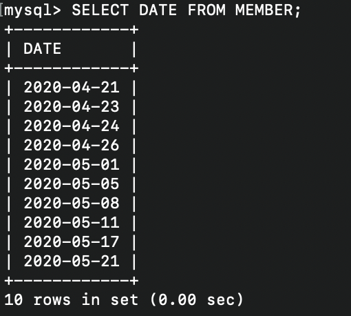 - 사용한 명령어 : SELECT DATE FROM MEMBER;