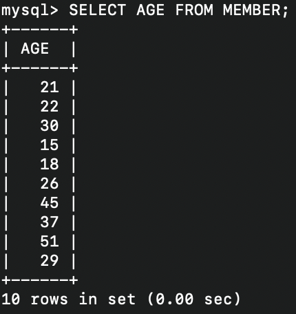 - 사용한 명령어 : SELECT AGE FROM MEMBER;