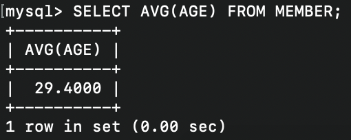 - 사용한 명령어 : SELECT AVG(AGE) FROM MEMBER;