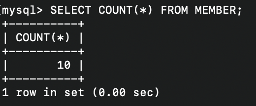 - 사용한 명령어 : SELECT COUNT(*) FROM MEMBER;