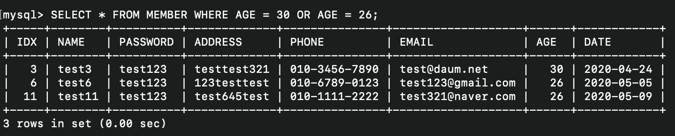 * 사용한 명령어 : SELECT * FROM MEMBER WHERE AGE = 30 OR AGE = 26;