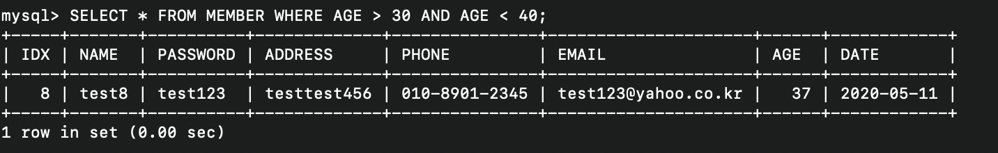 * 사용한 명령어 : SELECT * FROM MEMBER WHERE AGE > 30 AND AGE < 40;