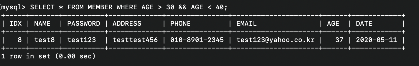 * 사용한 명령어 : SELECT * FROM MEMBER WHERE AGE > 30 && AGE < 40;