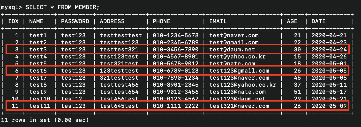 * 사용한 명령어 : SELECT * FROM MEMBER WHERE AGE = 30 || AGE = 26;