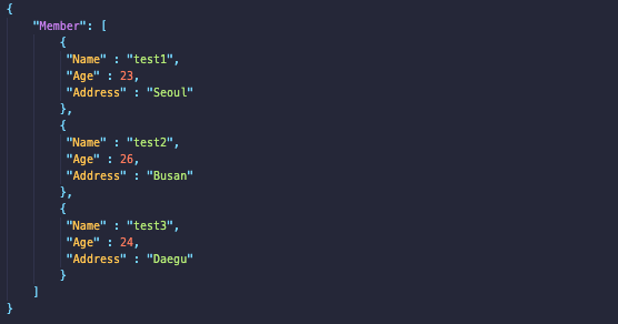 - { "ArrayName":[{Key1 : Value1, Key2: Value2, ...}, {Key1 : Value2, ...}] }
